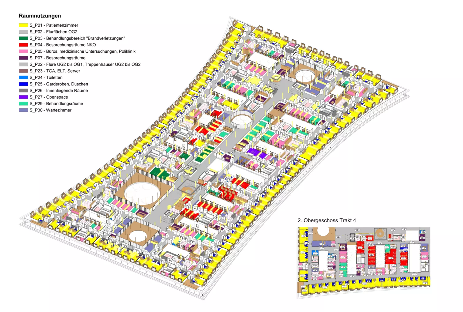 With a total floor area of 90,000 m², the new children's hospital in Zurich will set a milestone in the care of children and adolescents. The facility will be located on the neighbouring site of the Psychiatric University Hospital in Lengg. The subtle, elongated, three-storey acute hospital will be located on the southern site and will offer the full spectrum of paediatric surgery and adolescent medicine specialities. The building for research and teaching will set new accents on the north site with its circular appearance and six storeys. The highly complex building technology was planned by Gruner Gebäudetechnik Basel. To support the specialist planning, Bauklimatik was able to carry out thermal-energetic building simulations and energy calculations. As one of the first large-scale BIM projects, a CDE (common data environment) dRofus was used to digitally record basic information such as room utilisation, heating and cooling requirements and equipment inventory. The dRofus acted as a central source of information for building simulation and planning. Thermal-energetic building simulations were used to dynamically calculate the heating and cooling power requirements per identical utilisation zone (combined rooms). The simulation modelled 31 different room usage profiles and around 20 different ventilation systems with partial humidification and dehumidification. In post-processing, each of the 2,500 rooms was given a specific heating and cooling power requirement for the building services design. A subsequent annual energy simulation provided information on the total energy and power consumption of the acute hospital and research building and served as the basis for calculating the energy costs. In addition, the energy figures provided information about the simultaneous heating and cooling requirements and the optimum utilisation of waste heat. The simulation results were run on dRofus and output in parallel as an IFC space model with attached properties.