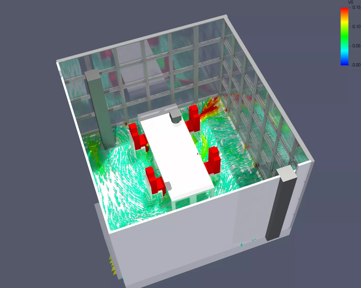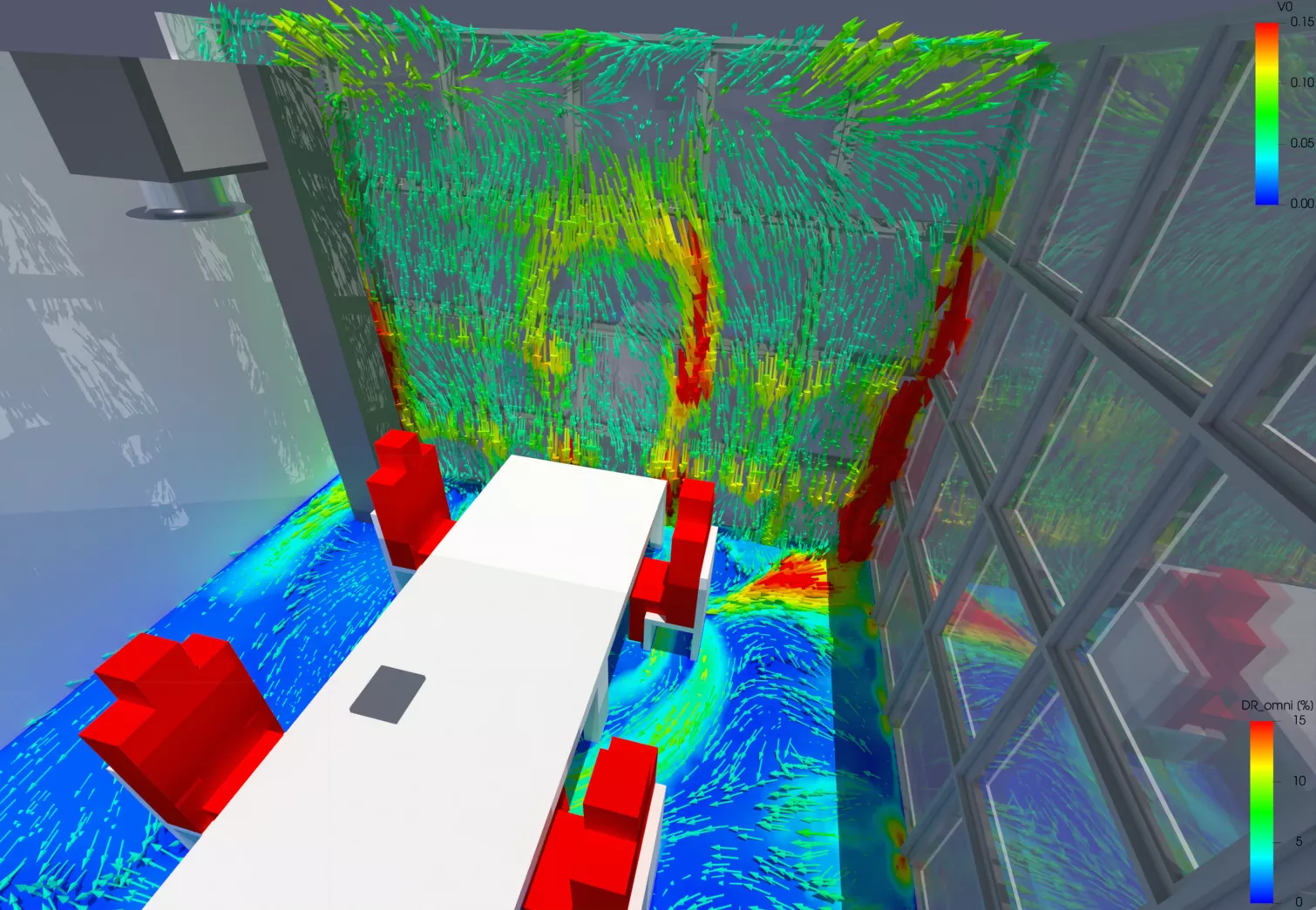 - En raison de la hauteur de la façade vitrée d'angle, une simulation de flux a été réalisée pour les bureaux d'angle du bâtiment principal. Cela a permis d'identifier et de corriger les courants d'air causés par la ventilation.