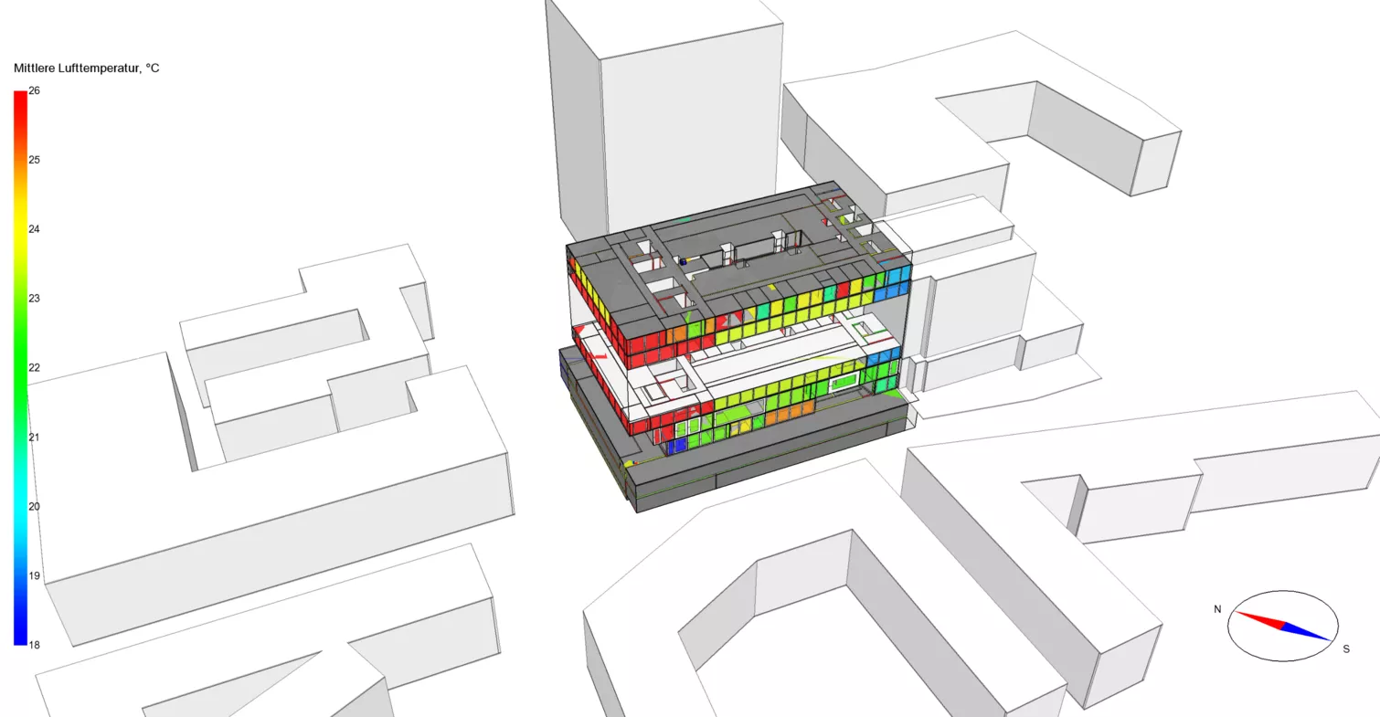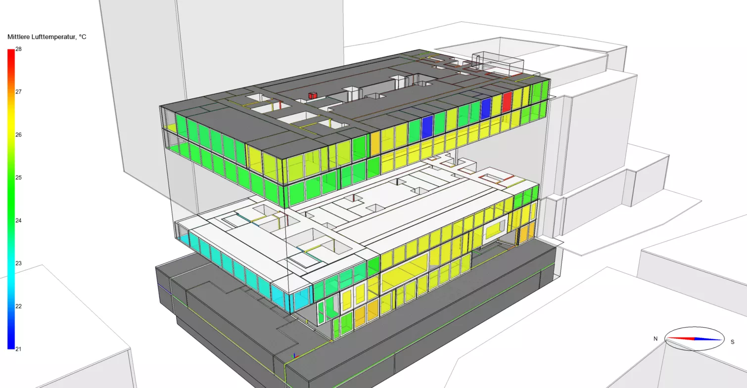 L'objectif de la simulation était de s'assurer que le niveau d'obscurité du verre n'est actif que quelques heures par an, tout en maintenant le confort et en veillant à ce qu'il n'y ait pas d'augmentation de la capacité de refroidissement prévue. Une fois que la demande de permis de construire a été déposée avec succès, un modèle global du bâtiment basé sur les zones a été créé sur la base de la planification de l'appel d'offres. L'accent a été mis sur l'utilisation avec 46 profils d'utilisation différents et le système TABS prévu. Les simulations thermiques et énergétiques ont permis de prévoir les conditions climatiques dans les salles pendant une année d'exploitation. Sur la base des simulations du climat intérieur, des mesures d'optimisation ont pu être déduites et ont fourni à l'équipe de planification spécialisée et au client une sécurité de planification et une base transparente pour la prise de décision.