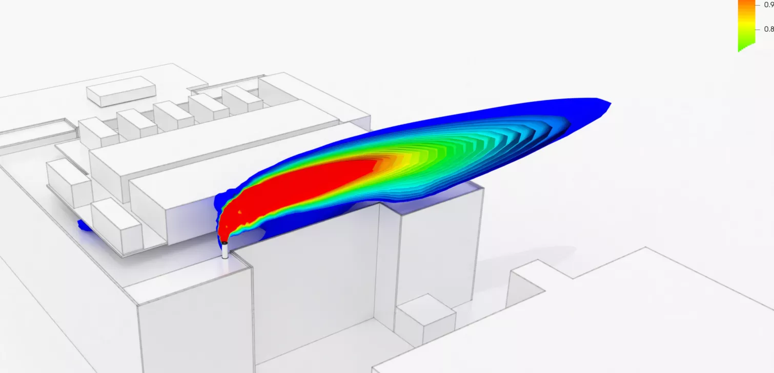 Die Konzentrationsdarstellung auf dem Grundriss ermöglicht ein besseres Verständnis der Ergebnisse und veranschaulicht das dynamische Verhalten der Rauchgasausbreitung, einschliesslich des Downwash-Effekts hinter dem Gebäude.
