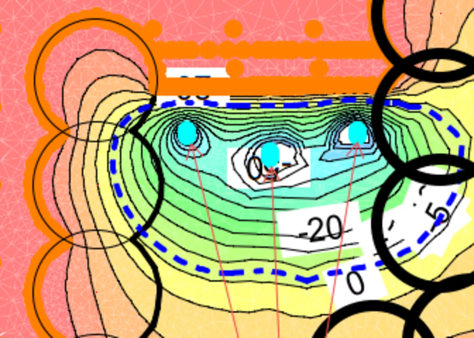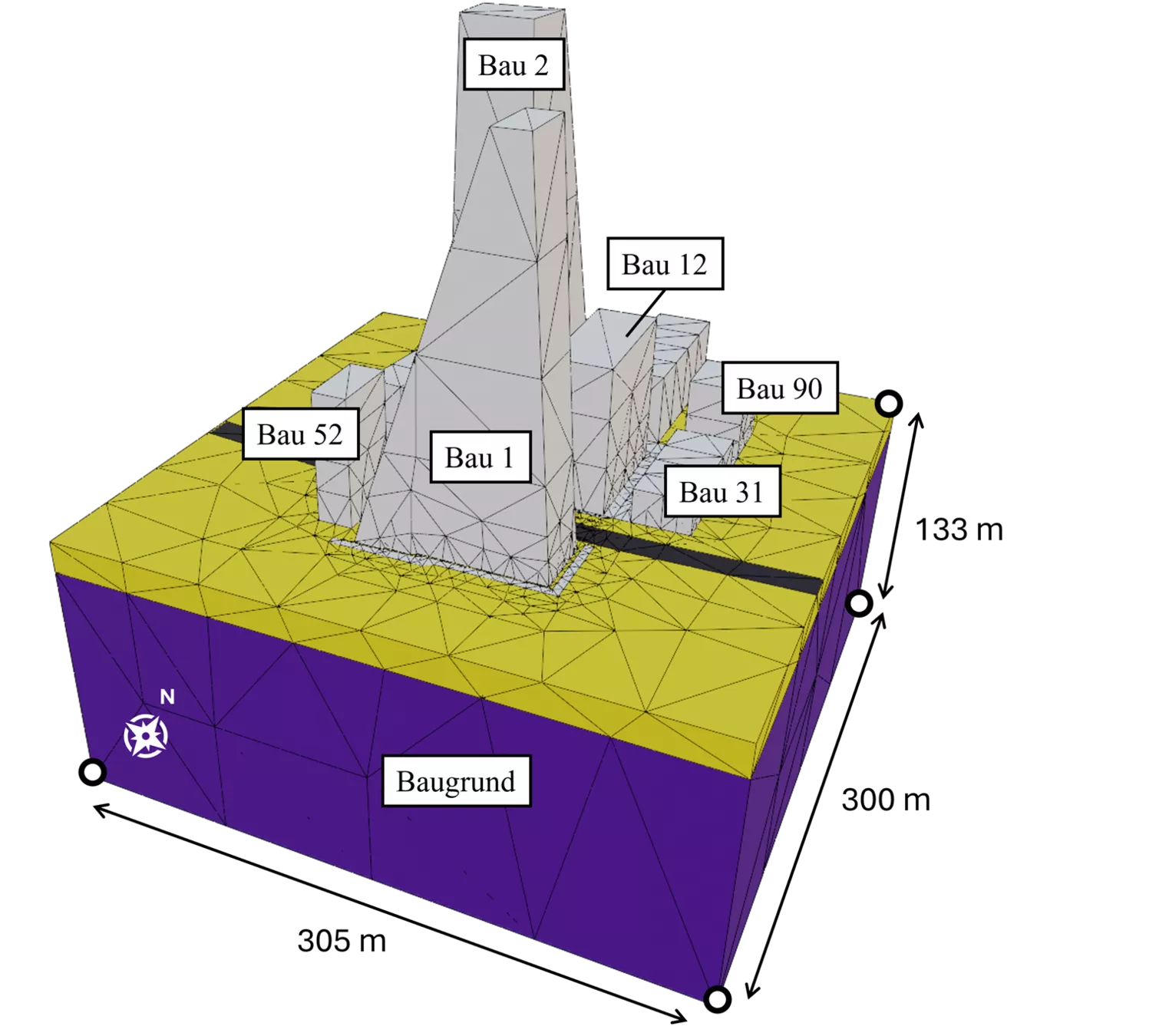 Eine aufwendige 3D-FE-Berechnung, nicht nur der Baugrube und Fundation von Bau 12, sondern auch der angrenzenden Bauwerke, ermöglichte eine zuverlässige Setzungsprognose für die verschiedenen Bauphasen. Dadurch konnte der Nachweis erbracht werden, dass die Setzungen innerhalb der Toleranzbereiche bleiben und auf Gründungspfähle verzichtet werden konnte. Somit war eine Flachfundation möglich, was dem Bauherrn erheblich Zeit und Kosten sparte.