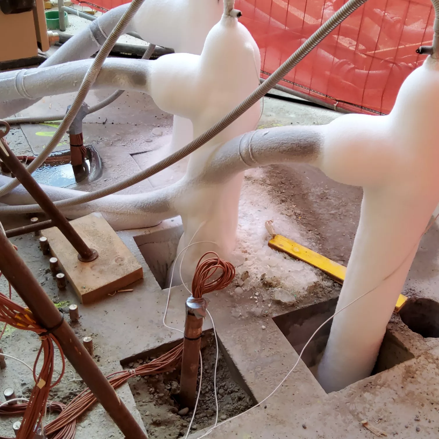 Eine weitere besondere Herausforderung war der Lückenschluss der Baugrubenumschliessung auf der Nordwestseite. In diesem Bereich der Baugrube, der aufgrund fehlender Zugänglichkeit nicht mit Bohrpfählen gesichert werden konnte, wurde eine Stickstoff-Baugrundvereisung vorgesehen. Diese diente der temporären Abdichtung und der Aufnahme der Erd- und Wasserdrücke.