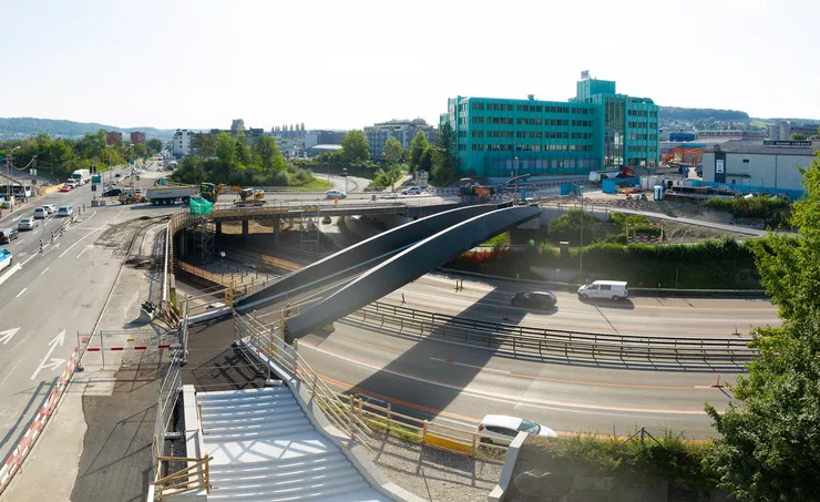At the beginning of the week, the new pedestrian and bicycle bridge Herweg over the A4 was officially opened. At the inauguration, the mayor of Urdorf, Sandra Rottensteiner, and the mayor of Dietikon, Roger Bachmann, cut a ribbon in the middle of the bridge. The 50 meter long Herweg bridge replaces the footpath on the Bernstrasse overpass, as this area is needed for the route of the Limmattalbahn. It connects the new Herweg stop in Urdorf with Bernstrasse on the opposite side of the freeway. The bridge was completed on time and successfully according to planning.